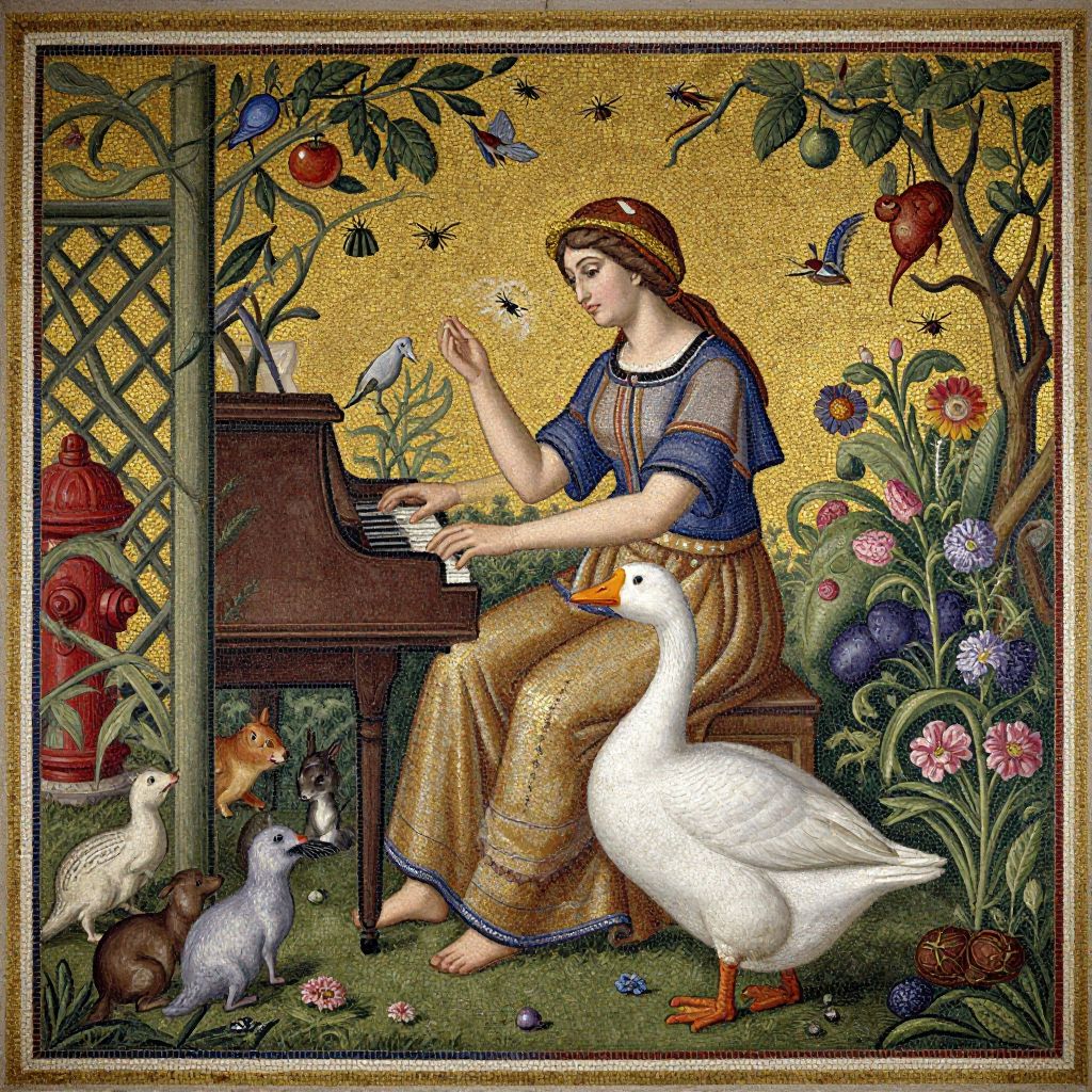 A Byzantine style mosaic showing a woman Elle playing her piano, She is sitting in the garden, surrounded by lattice fence, nature, flowers, birds, insects, small mammals, fruits and vegetables, The musical sound attracts small animals who approach in joy, A pure white goose sets at her feet admiring her music, There is a modern red fire hydrant visible in the background, Gold leaf style, Baroque oil painting by Caravaggio circa 1600