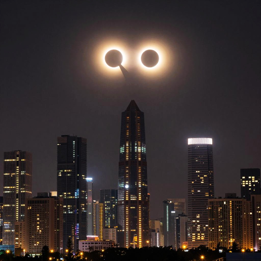 Eclipse sky, futuristic city skyline under a rare dual eclipse, glowing celestial bodies aligned, neon lights reflecting off modern skyscrapers, a blend of natural wonder and technology