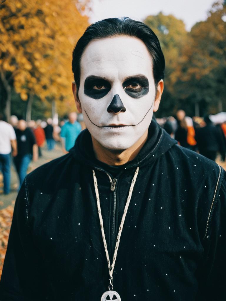 Portrait of a man wearing a high quality Halloween skeleton face paint with black and white makeup, dressed in a black jacket. The image is taken outdoors during a festival or event with carnival tents and a carved pumpkin visible in the background. Natural light highlights the detailed makeup and facial expression.