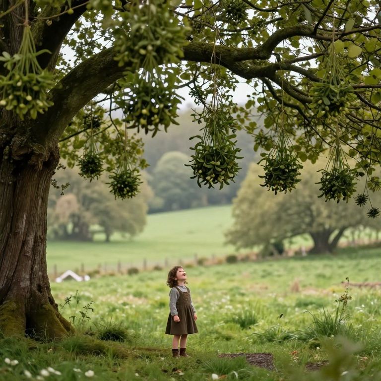 In a verdant valley where laughter takes root, mistletoe-shaped whispers dangle from ancient branches, weaving a tapestry of joy and wonder for the small figure below, who stands as a beacon of innocence amidst the timeless embrace of nature.