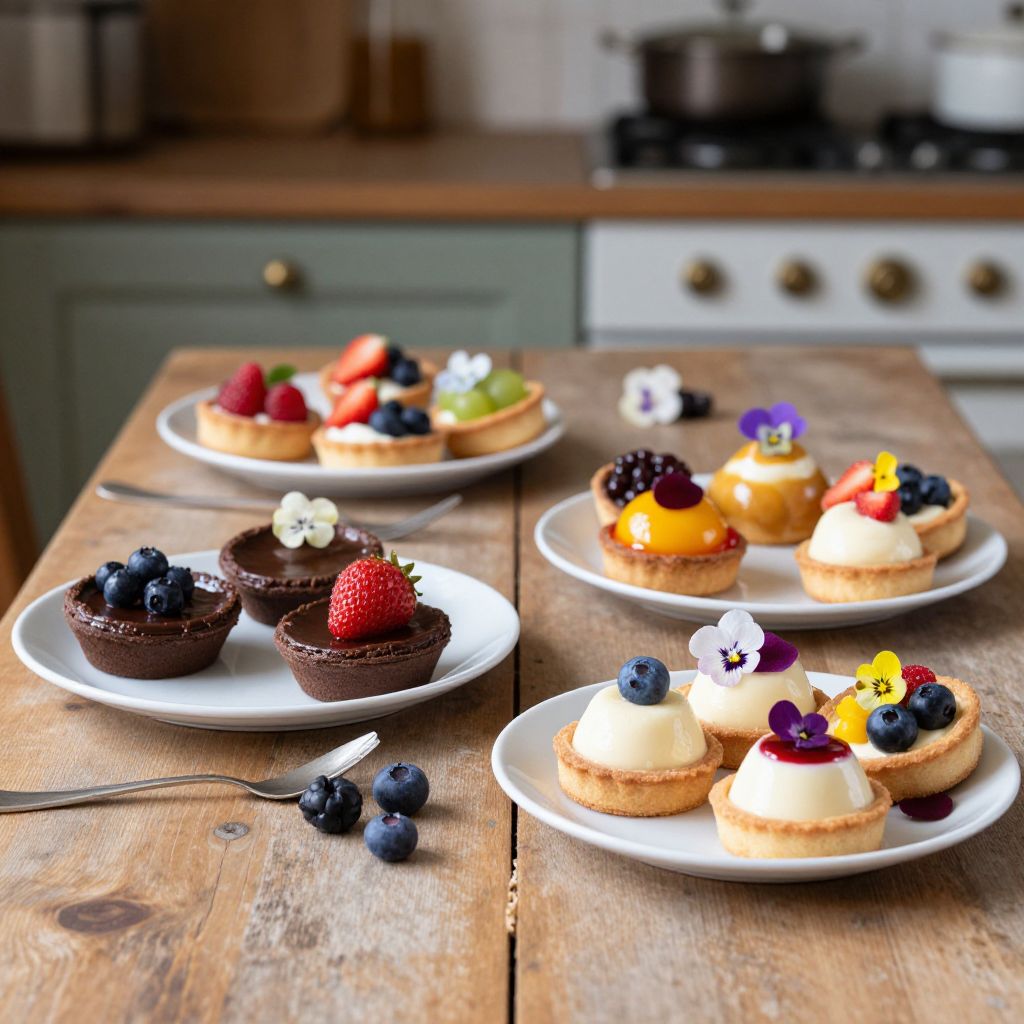 Dolci arranged elegantly on a rustic wooden table, featuring rich chocolate tarts, vibrant fruit-filled pastries, and creamy panna cotta, all styled with fresh berries and delicate edible flowers, set against a softly lit Italian kitchen background, showcasing tempting Italian desserts.