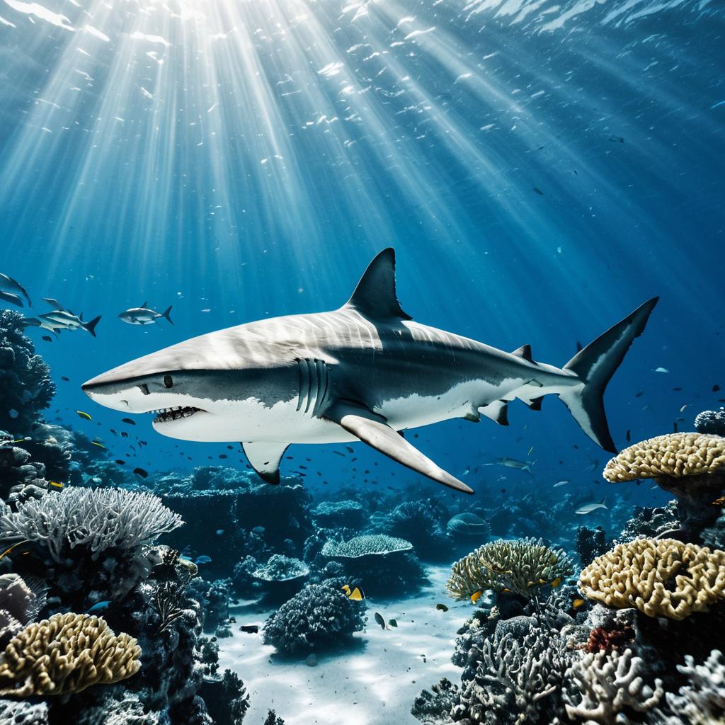Underwater photo showing a great white shark swimming above a vibrant coral reef. Sunlight beams penetrate the clear ocean water, illuminating the shark and reef ecosystem. Various coral types and small fish are visible, creating a rich marine environment.