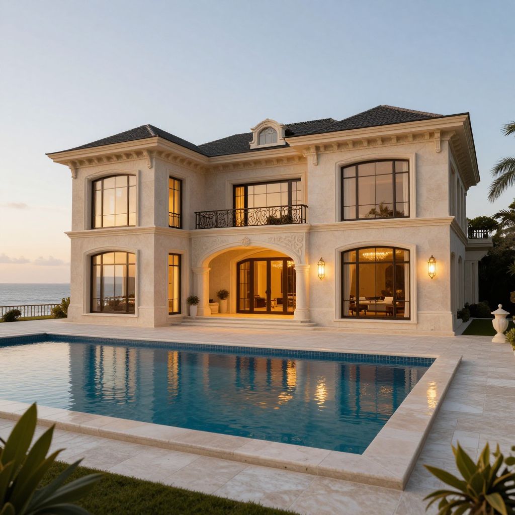 Modern villa showcasing sleek architecture with expansive glass windows and balconies overlooks a serene pool area, featuring two lounge chairs and a well-manicured garden with palm trees and illuminated shrubs, all set against the backdrop of a twilight sky.