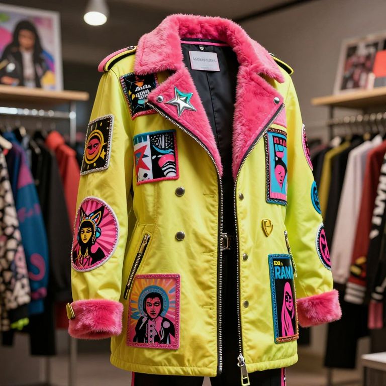 Photograph of a vibrant yellow jacket with pink fur collar, adorned with colorful pop art patches, displayed in a modern clothing store.