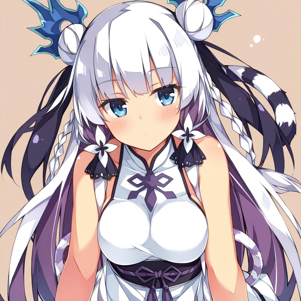 Digital illustration of a young anime girl with two-tone white and purple long hair styled in double buns and twin braids. She has striking blue eyes, medium breasts, bare shoulders, and wears a traditional white and purple Chinese-inspired dress. The character features a distinctive tiger tail and floral hair accessories, set against a plain beige background.