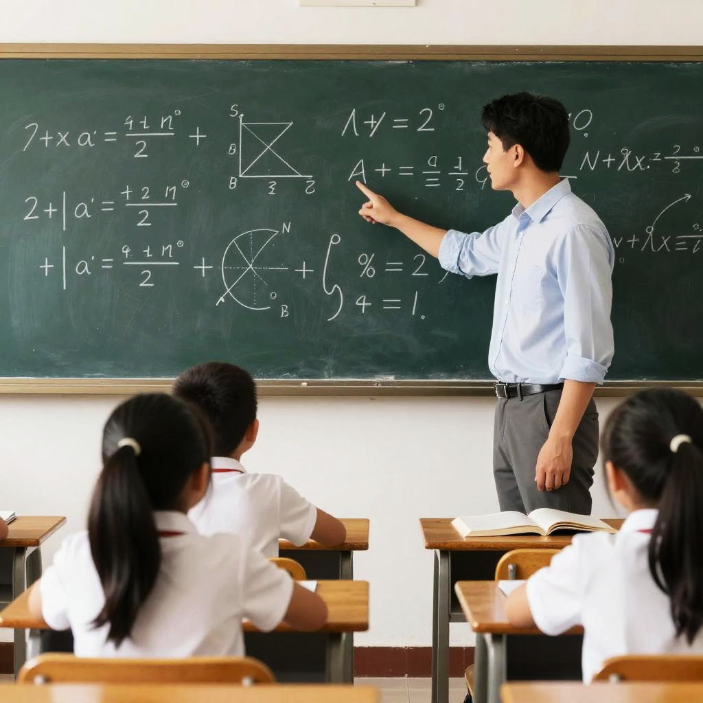 Teacher pointing at student with inspiring gesture, rustic classroom with wooden desks, chalkboard filled with math equations, attentive children, soft afternoon light, hyperrealistic style