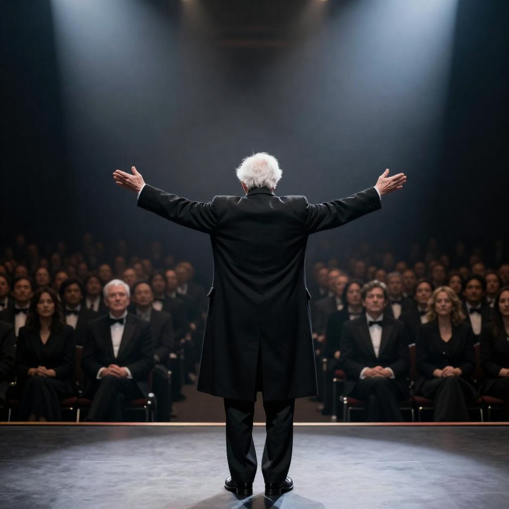 An elderly man with white hair and a long black coat stands center stage with arms outstretched, facing a large audience dressed in formal dark attire. The scene is dimly lit with foggy light beams illuminating the man from above, creating a dramatic atmosphere in a theater or auditorium setting.