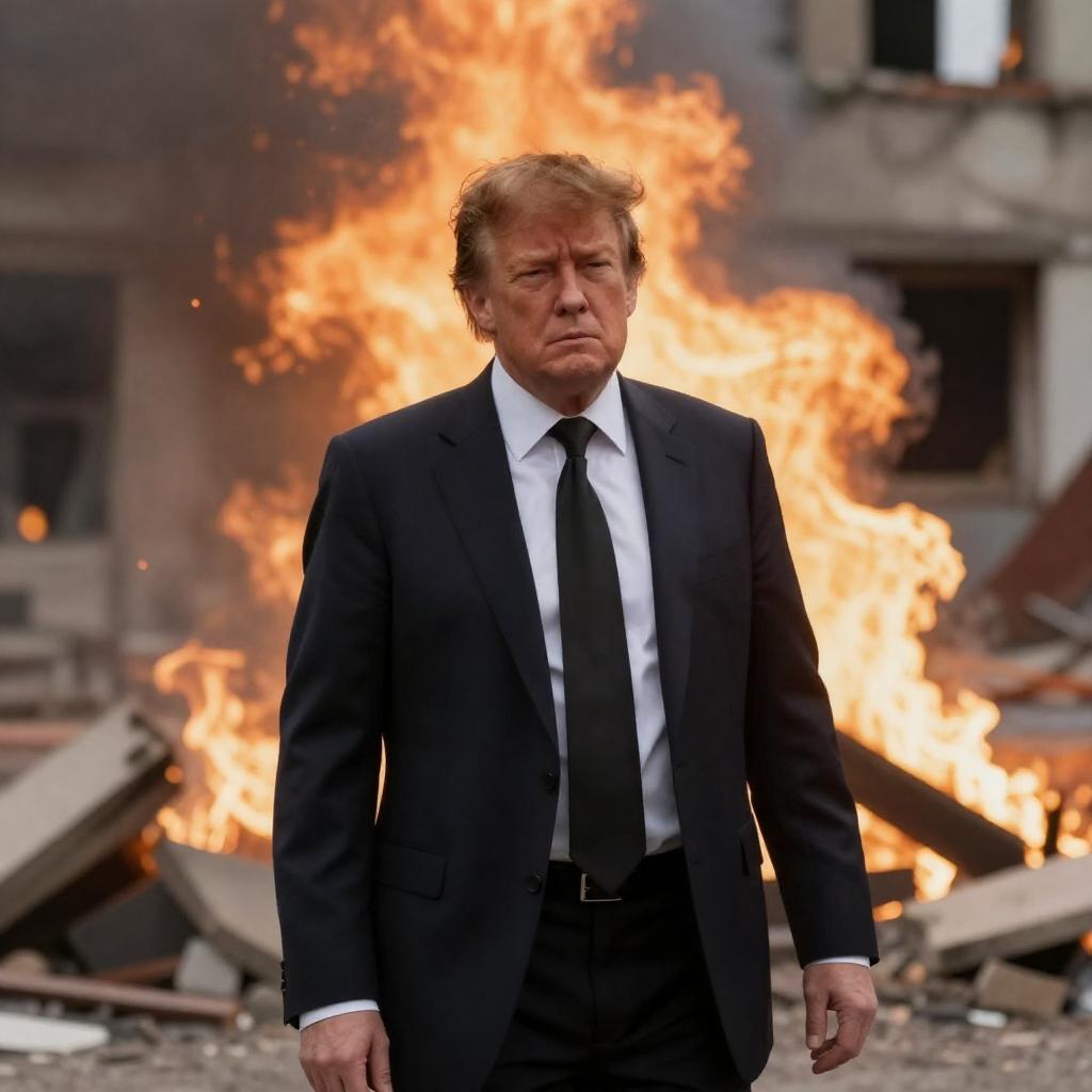 A photograph of an elderly man with white hair and a long black coat, standing center stage with arms outstretched, addressing a large, dimly lit crowd in dark, formal attire. Foggy light beams illuminate the scene from above.