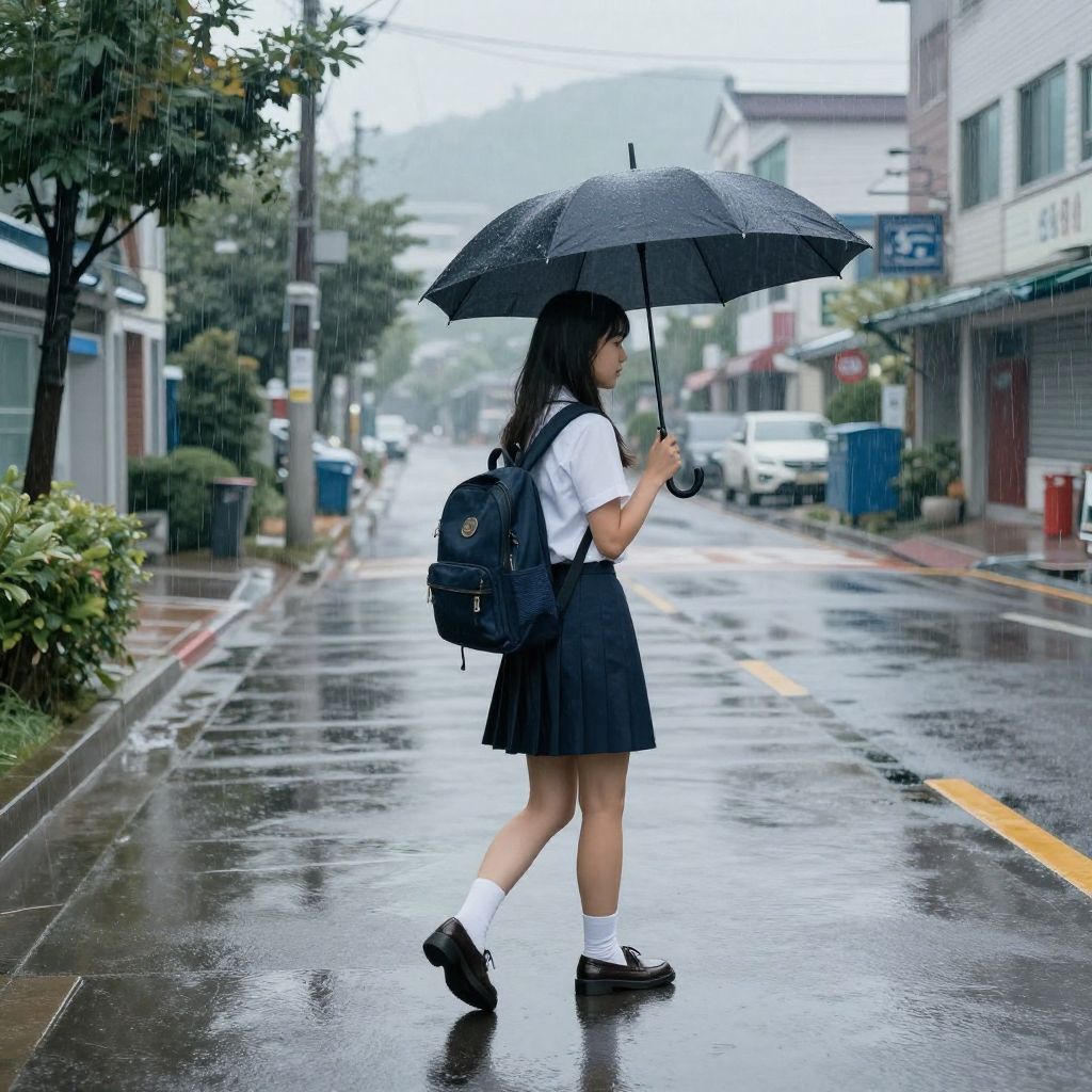 Korean schoolgirl with backpack walking under rainy sky, reflective wet pavement, umbrella, moody lighting, impressionistic style, urban school setting
