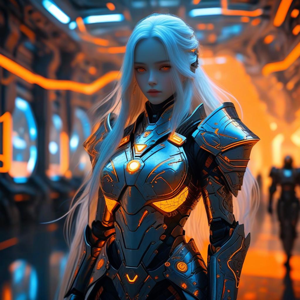 A mystical figure wearing futuristic armor with glowing orange lights embedded in dark metallic surfaces, long white hair flowing, detailed intricate patterns on armor, sci-fi fantasy setting with blurred figures in armored suits in the background, glowing blue and orange color tones