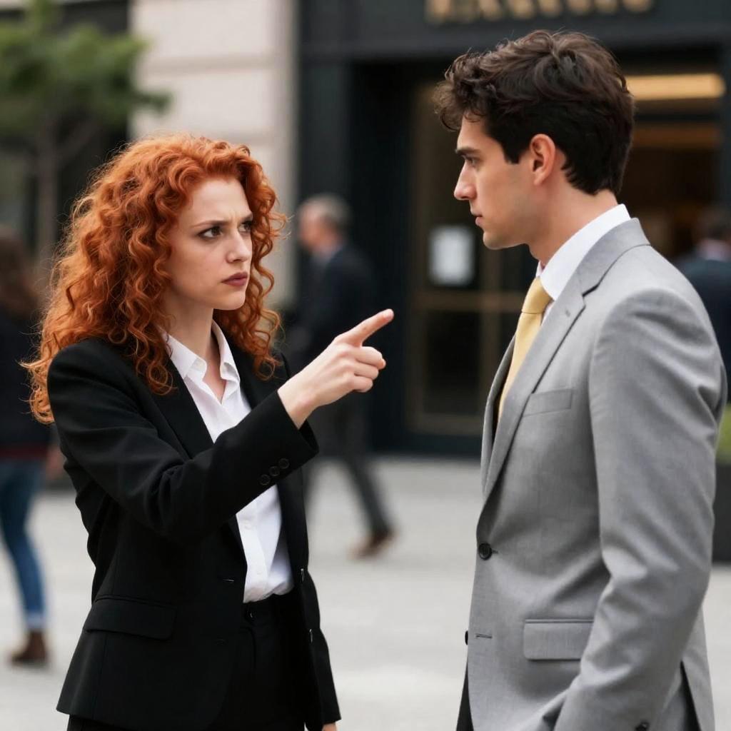 Photograph of two people. A man with brown hair, beard, and mustache, wearing a brown jacket, white shirt, and black tie, raises his right fist, mouth open in anger. A woman with curly brown hair, facing him, wears a black top. Background includes a wall with faint drawings and a door. Intense expressions.