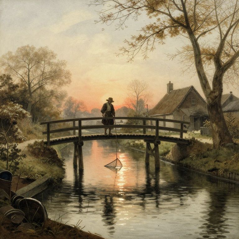 Imagine a serene watercolor landscape capturing a tranquil canal scene with delicate brushstrokes reminiscent of 17th-century Dutch masters. The composition focuses on a wooden footbridge arching over a reflection-laden stream, where sunlight filters through sparse trees and casts dappled light on the rippling surface. A solitary figure stands on the bridge, their weathered hat pulled low against the warm glow of the setting sun as they cast a net into the shimmering water below. The scene exudes peace and introspection, with muted earthy tones predominating, punctuated by warm orange hues emanating from a distant cottage nestled along the canal bank. This evocative composition invites viewers to pause and immerse themselves in a world where tranquility blends with subtle moments of contemplation.