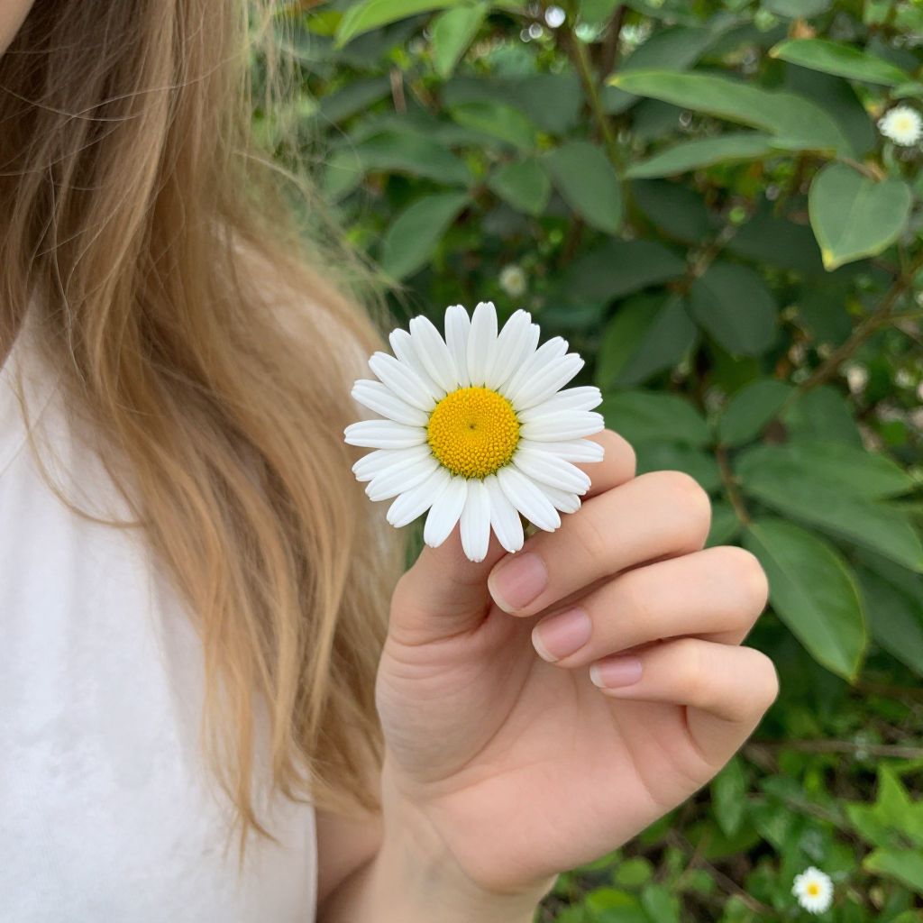 Photograph of a person's hand holding a white daisy with a yellow center, positioned slightly to the right. The person's light brown hair, partially visible, falls over a white shirt. The background features lush green foliage with a few small white flowers. The hand has a light skin tone and the nails are neatly trimmed and natural. The daisy's petals are crisp and white, contrasting with the vivid green leaves and subtle white flowers in the background. The image has a natural, vibrant color palette and a soft focus on the background.