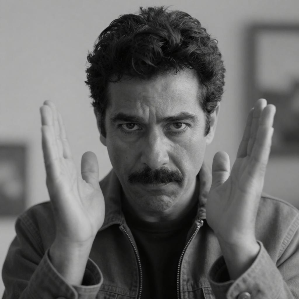 Black-and-white photograph of a man with short dark hair, intense gaze, wearing a dark coat, sitting in a dimly lit room. Background is blurry with indistinct shapes. Man's face centered, hands resting on a surface in front.