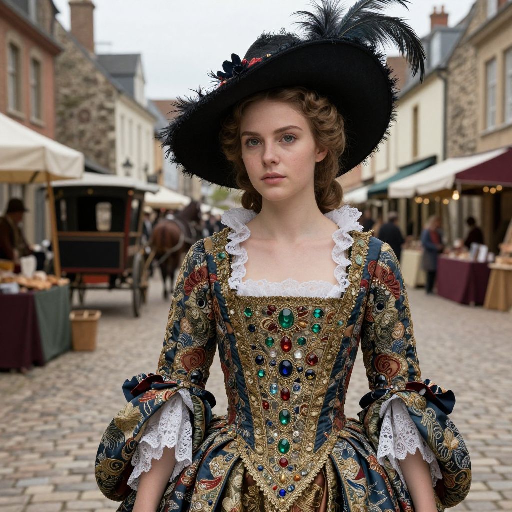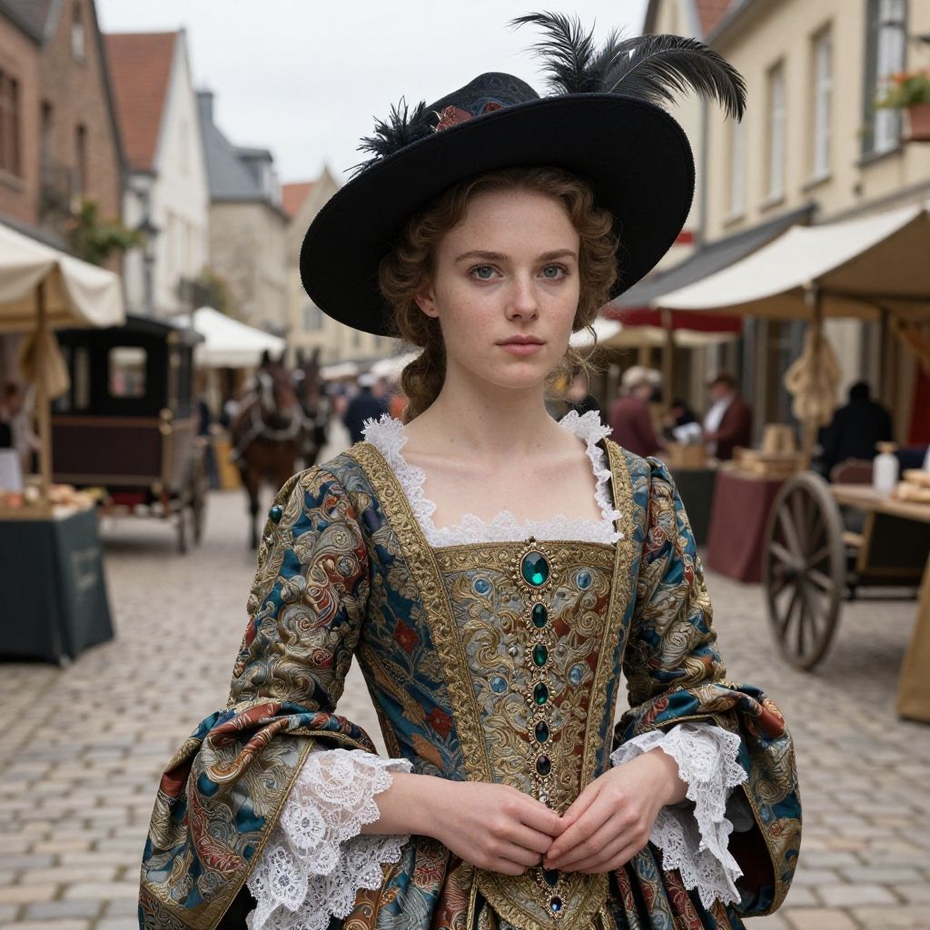 Hyperrealistic art 1girl, Amelia Sinclair, the intrepid investigator in a 1640s historical setting. Cloaked in a rich, brocade gown with lace accents, she navigates the cobbled streets of a historic European town. A wide-brimmed hat adorned with feathers adds a touch of elegance to her ensemble. The dress, a testament to Baroque opulence, features deep jewel tones and intricate embroidery. Capture the scene with a classic painted effect, using a period-appropriate camera obscura. Frame Sinclair amidst market stalls and horse-drawn carriages, employing a mid-angle perspective to evoke the charm and mystery of the 17th century., (masterpiece:1.3), (extremely intricate), (photorealistic:1.4), (extremely delicate), (ultra realistic:1.3), CG unity, 8k wallpaper, HDR, RAW photo, dslr, front lighting, fantasy, elegant, lifelike, photorealistic, (realistic skin texture, soft light, sharp:1.2), crisp image, sharp image, clear image, vivid image, noiseless image, OverallDetail, (prettify), (((full body view:0.86))), (very beautiful young female face:0.8), (high detailed skin texture, intricate face), (highly symmetric proportions:0.6), perfect teeth, (sharp_pointed_nose:0.6), high detailed eyes, intricate eyes, cute female face, (((determined facial expression:1.2)), The jaw may be set, and the eyes show a focused, intense gaze. This expression conveys resolve and strong determination, award wining masterpiece conveying a sense of peace and tranquility, Within a realm of enchantment, flawless, clean, subsurface scattering, photographic, realism pushed to extreme, fine texture