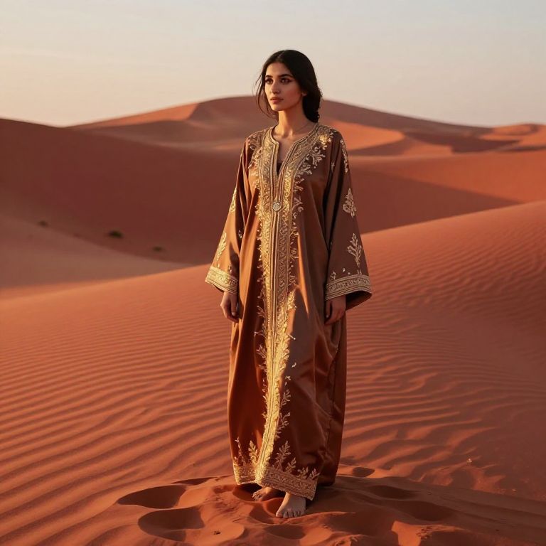 Photograph of a young woman with medium brown skin and long black hair standing in a vast desert with rolling sand dunes under a warm, orange sunset. She wears an ornate, brown, traditional long tunic with intricate gold embroidery along the edges and down the center, which reaches her ankles. She stands barefoot on the rippled sand, with her arms relaxed by her sides. Her expression is calm, and she gazes slightly to the right. The background features soft, undulating sand dunes bathed in the golden light of the setting sun.