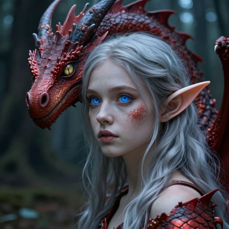 Digital fantasy artwork of a fair-skinned woman with long black hair, wearing a red and gold dress, and a gold crown, intimately embracing a large