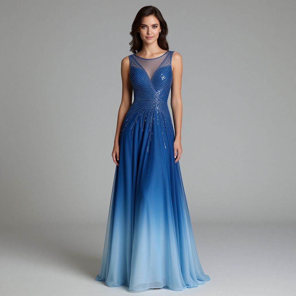 Elegant woman showcasing a high-quality 2018 modest prom dress featuring an ombre royal blue gradient with sequin embellishments, perfect for formal evening events.