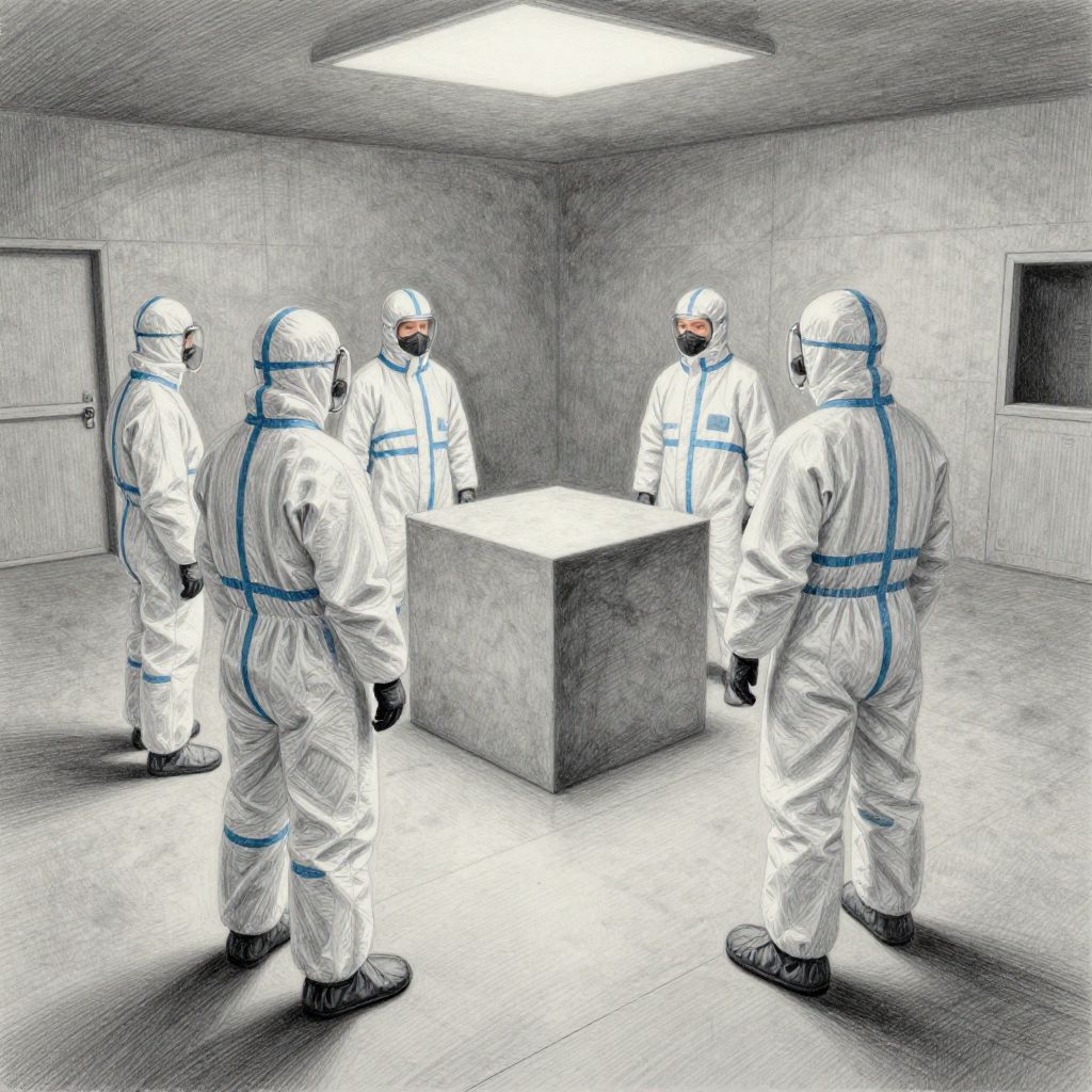 Staff a realistic pencildrawing of a group of five men in radiation protection suits surounding a cube in the middle of an empty concrete room. Futuristic. Eerie.,