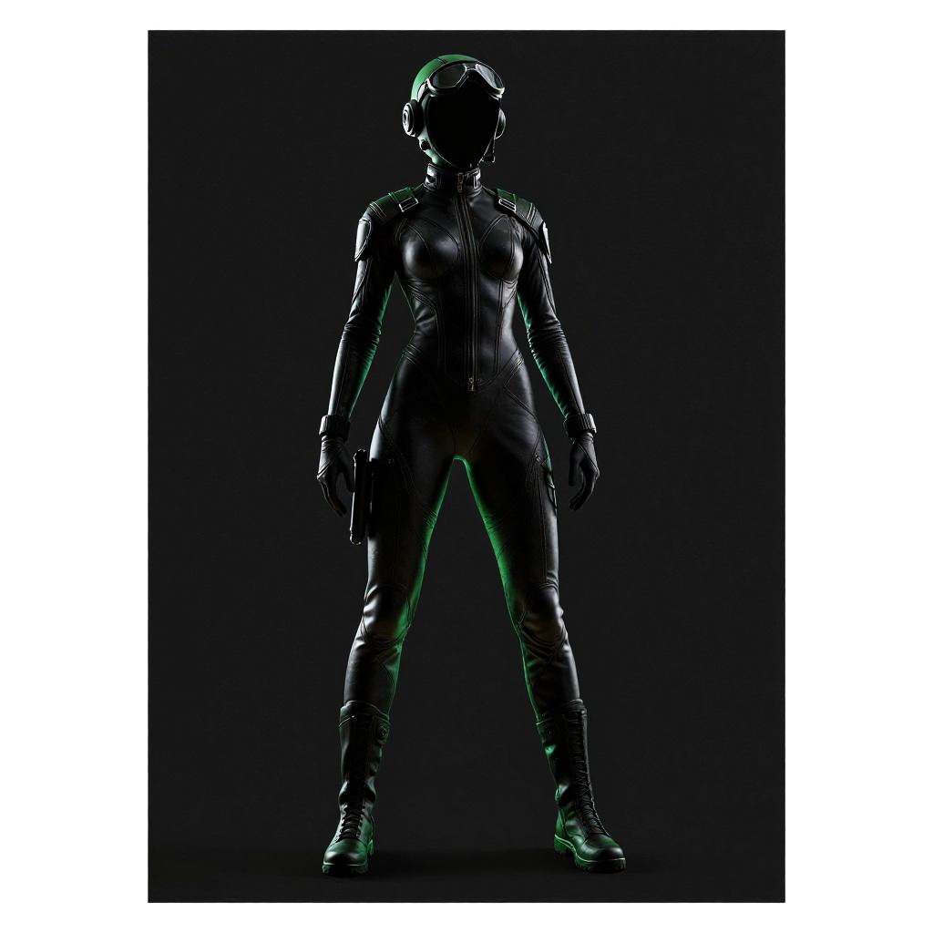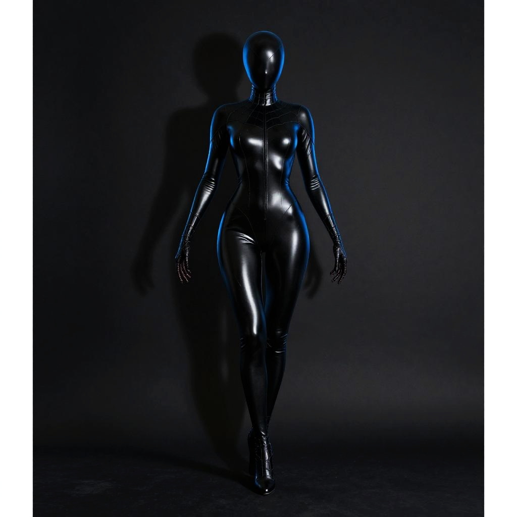 Photograph of a glossy, black, full-body latex mannequin with a featureless, smooth face, standing in a dark, shadowy background