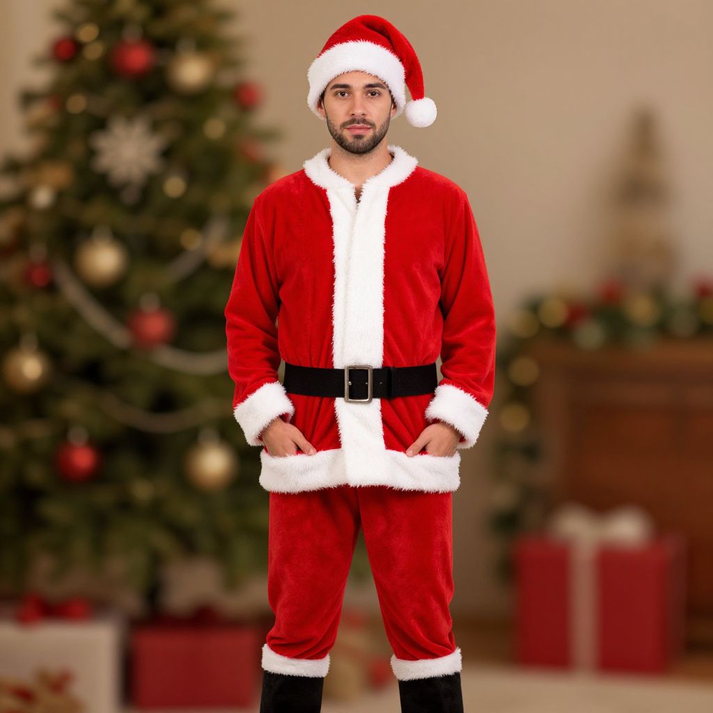 Photograph of a bearded man standing in a festive living room. He wears a red Santa Claus outfit with white fur trim, black belt, and black boots. His hands are in his pockets. He has a light brown skin tone and dark hair. Behind him is a decorated Christmas tree with ornaments and lights, slightly blurred. The background also includes wrapped presents and a wooden cabinet. The image has a warm, holiday atmosphere with soft lighting.