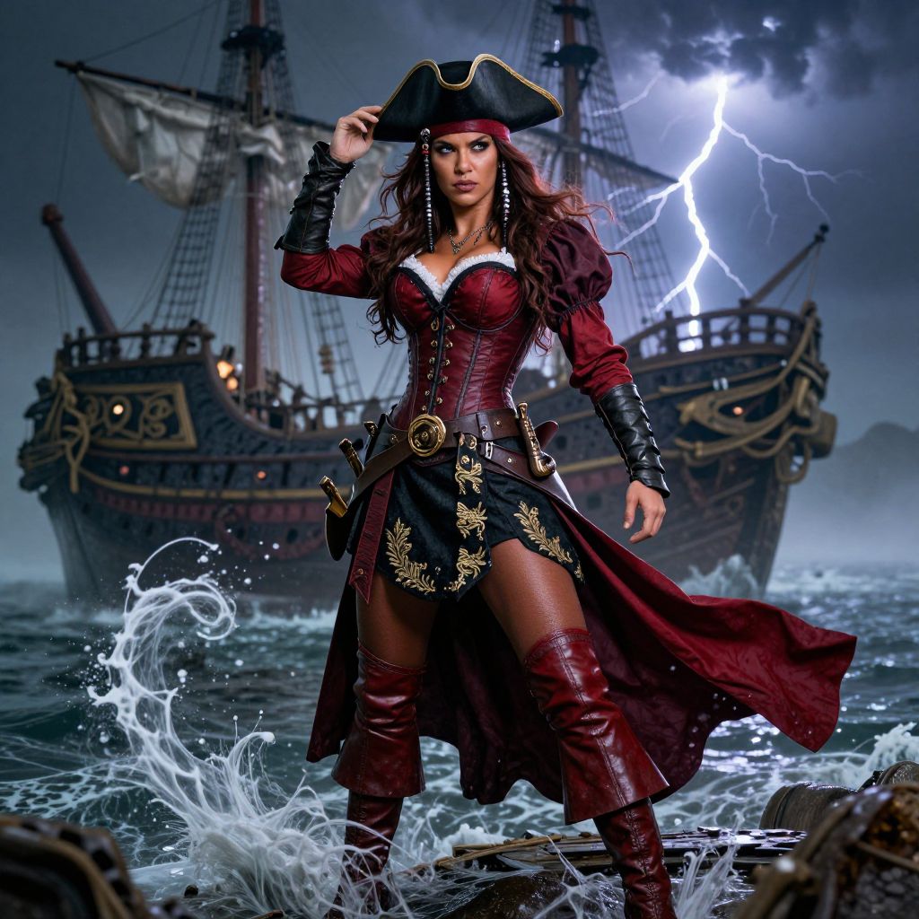 A bold and commanding pirate queen in a detailed costume, tricorn hat tilted back, her face strong with a fierce expression, sharp cheekbones and a tanned olive complexion, wearing a deep red corset and matching leather boots, standing beside a sunken ship in a foggy bay, seawater swirling around her, red and black flowing dress with gold embroidery, dramatic lighting from a nearby lightning storm