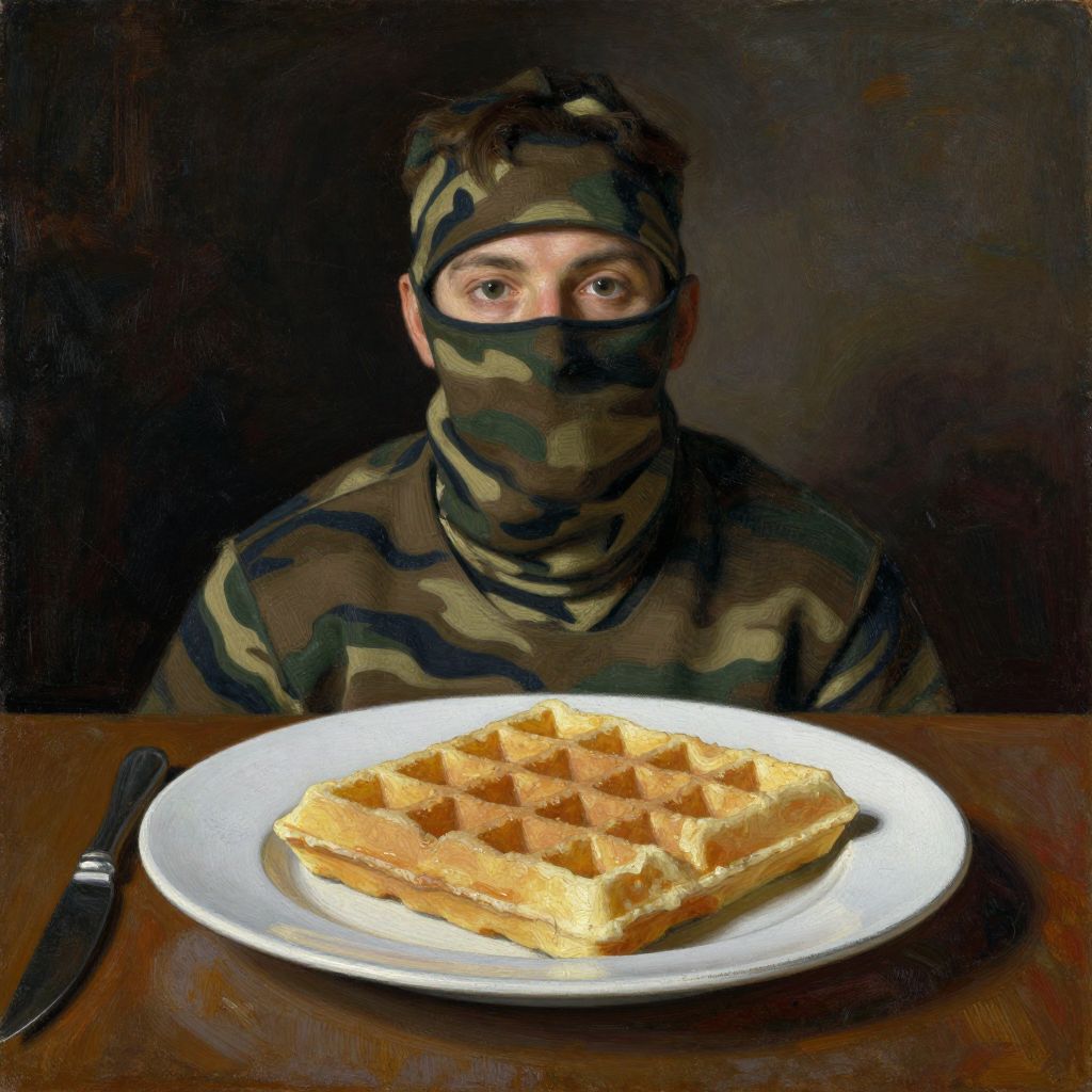 Portrait of a man camouflaged as a waffle on a plate still-life graham sutherland ilya repin brad rigney winslow homer eyvind earle dan witz mark ryden palette knife artwork