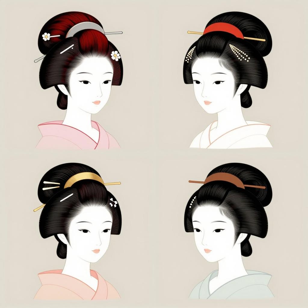 Illustration of a Japanese woman with dark hair in an ornate kimono, flying a fish kite with intricate patterns. She has a calm expression and sits near a reflective water surface. Below, two fish with detailed scales swim. Her kimono has a black and white patterned sash. The background has minimalist, shaded hills and sparse grass. The reflection of the woman and kite is clear in the water.
