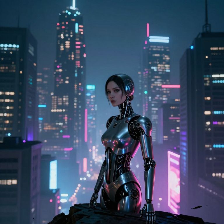 A CGI image depicts a futuristic cityscape at night with neon lights and holographic screens. A silver, robotic woman with blue eyes and metallic features stands facing a dark-haired man in a gray shirt. She has an intricate, glossy mechanical build, with visible wires and circuits. The background shows a bustling city with colorful, illuminated skyscrapers. The man looks up at the woman, who gazes back with a calm expression. The scene exudes a cyberpunk aesthetic, with vibrant lights and advanced technology. The image is highly detailed, with a focus on the contrast between the robotic woman and the human man.