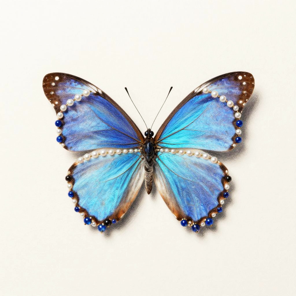 Illustration of a dwarf seahorse adorned with aquamarine bead strands, pearl necklaces, and a small crown with blue gemstone accents. The seahorse is depicted against a subtle ocean teal seamless background with soft gouache texture and precise linework, emphasizing high detail and a clean, centered composition.