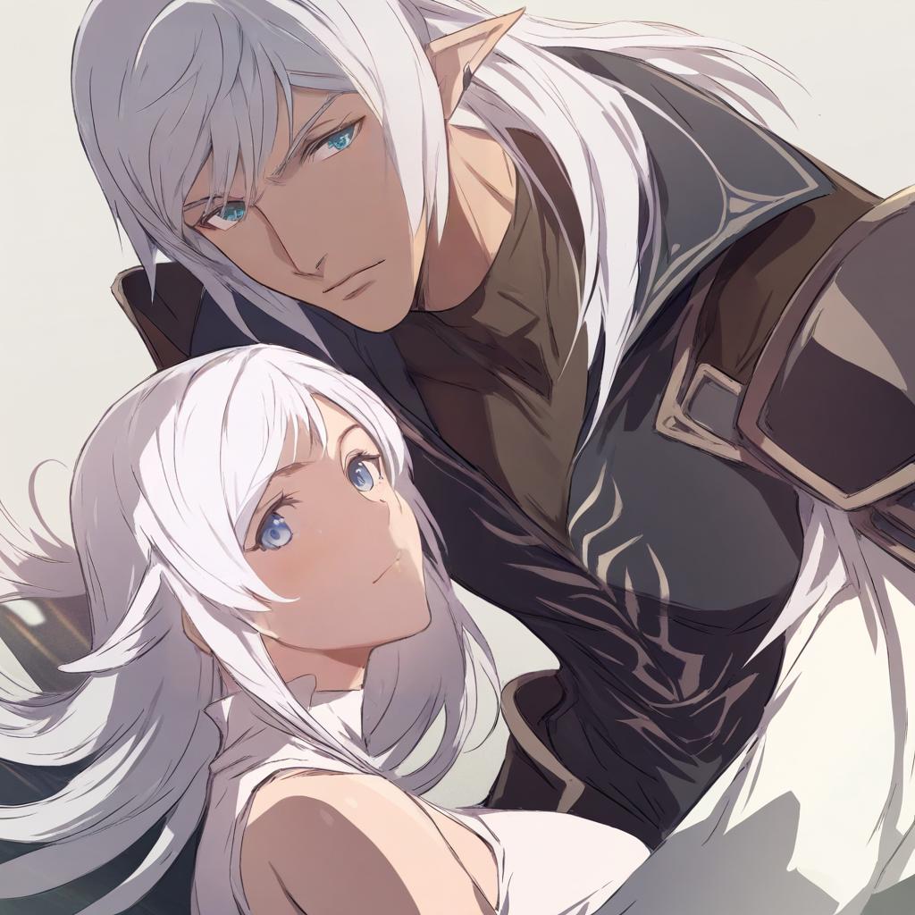 Digital anime-style artwork featuring a male and female elf character. The male elf has long white hair, grey eyes, pointed ears, and wears black attire with pauldrons. The female elf has long white hair and blue eyes, with a sleeveless white garment. Both characters exhibit fantasy and Final Fantasy-inspired design elements.