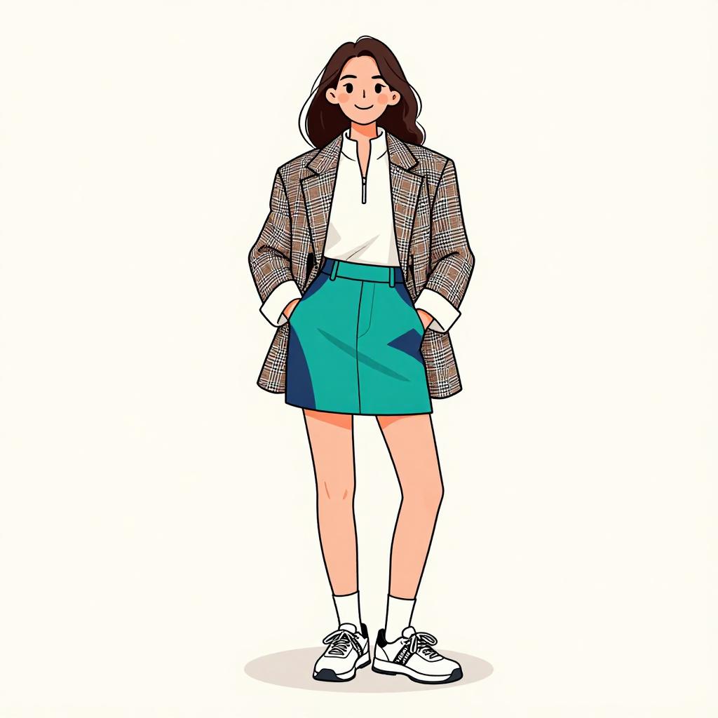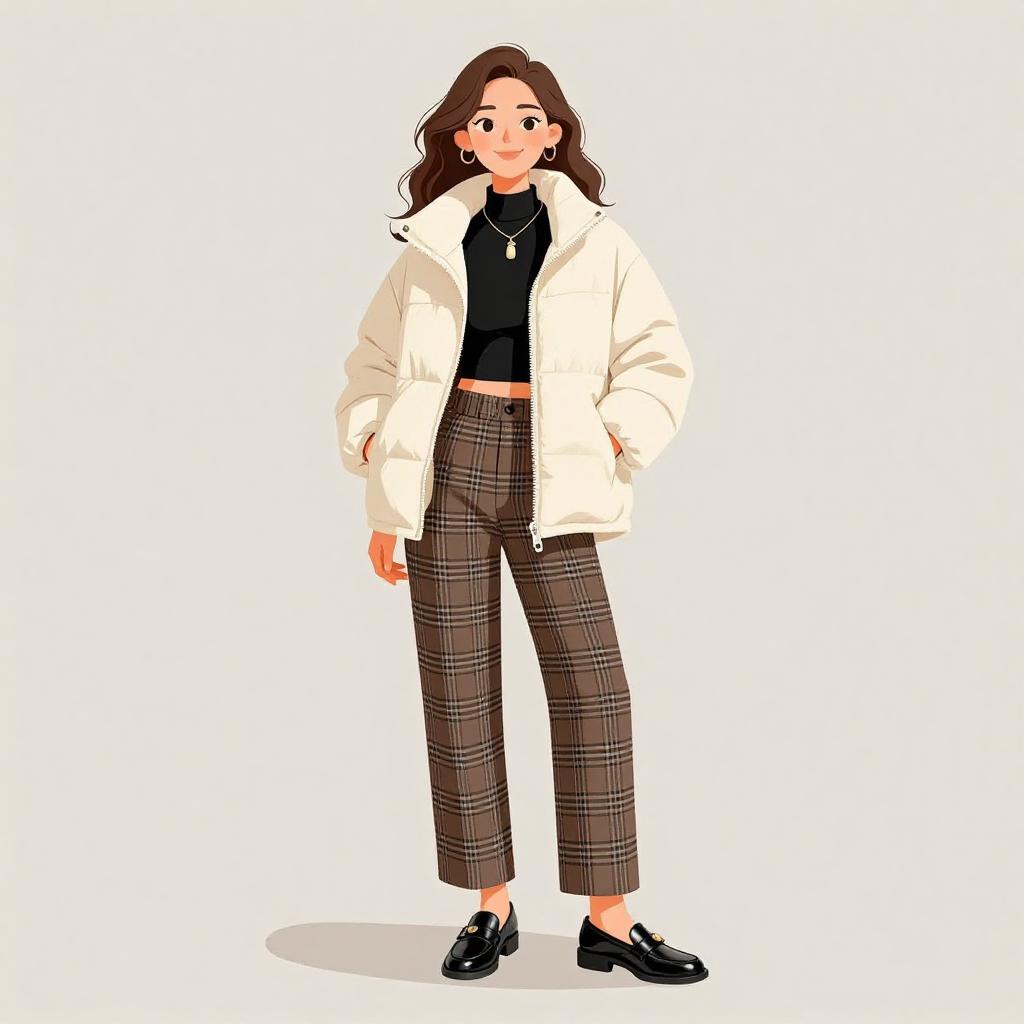 Woman with pretty face and pretty hair. smiling Woman, casual streetwear, orange cropped sweatshirt, high neck, long sleeves, houndstooth coat in brown and black, knee-length, oversize fit, wide lapels, olive green high-waisted joggers, relaxed fit, cuffed hem, black and white sneakers, minimal jewellery, simple background with plain light color. --sref 1467