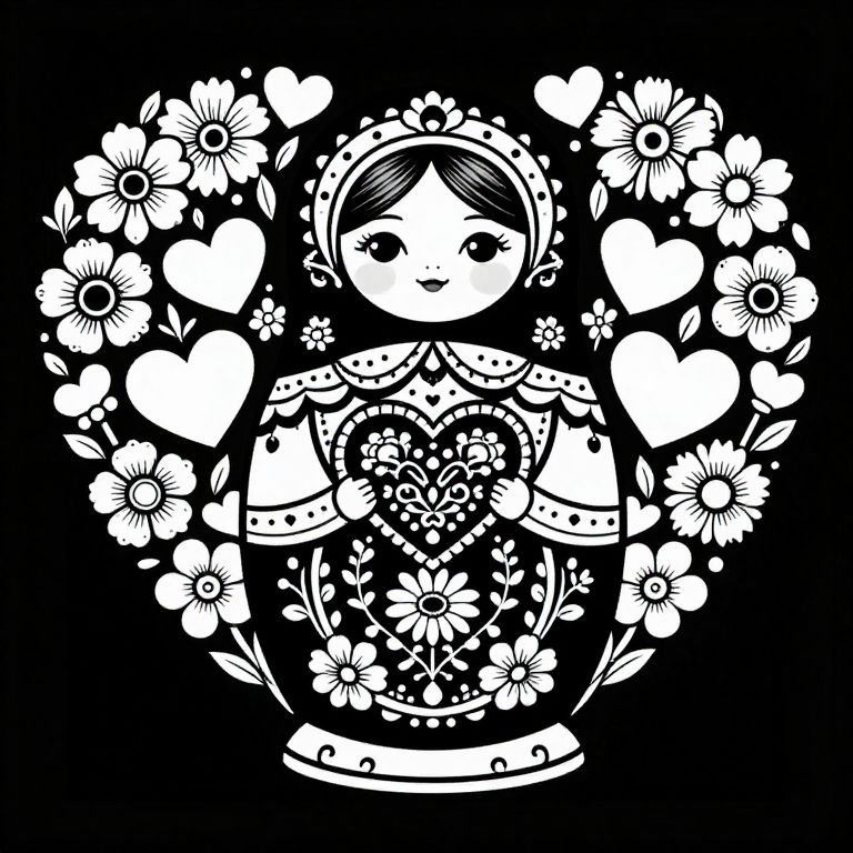 The image presents a striking black and white illustration of a queen of hearts matrioshka doll, characterized by bold line art. The doll, adorned with intricate floral patterns, holds a heart-shaped object in its hands, which also features elaborate designs. The doll is surrounded by a dense array of flowers and hearts, creating a symmetrical and balanced composition. The background is a stark black, which contrasts sharply with the white elements, emphasizing the detailed line work and patterns. The overall arrangement of the flowers and hearts forms a heart shape, adding to the thematic coherence of the image. The doll's long, flowing hair and the ornate headpiece further enhance the regal and decorative aesthetic. The image is devoid of shading, relying solely on the interplay of lines and shapes to convey depth and texture.