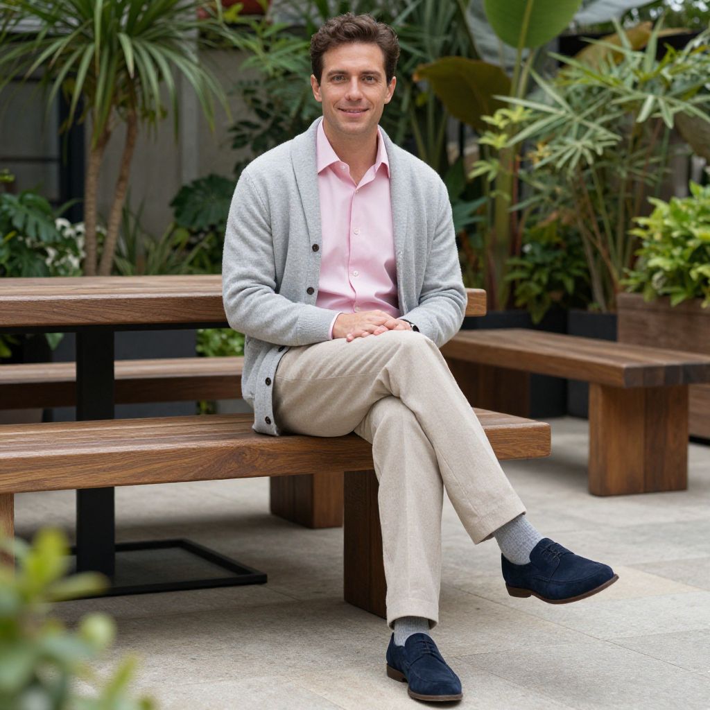 A man, pale pink button-down shirt, beige wool slacks, navy suede shoes, light gray cardigan, modern fit, open-air courtyard, wooden benches, lush greenery, cinecolor, relaxed smile, inviting demeanor. Man has masculine face and piercing eyes