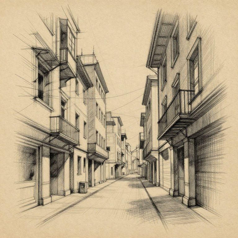 Sketch reference ideas showcasing architectural elements with perspective depth, rough pencil and charcoal strokes on aged paper, highlighting light and shadow to create a dramatic urban scene.
