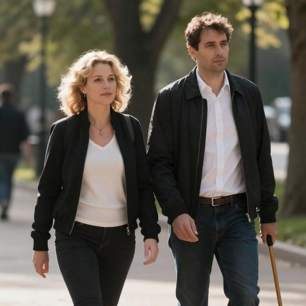 Photograph of a man and woman walking in a park. The woman, with curly blonde hair, wears a black jacket over a white top. The man, with dark hair, wears a black jacket over a white shirt and holds a cane. Sunlight filters through trees in the background.