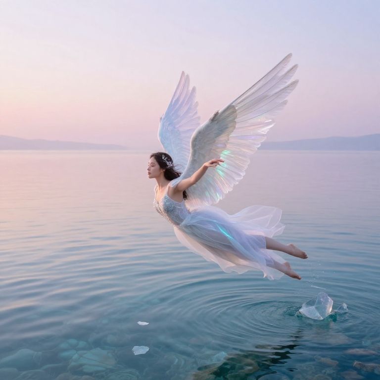 Photograph of a winged woman in a white, flowing dress, flying over calm, reflective water at dawn, creating ripples below.