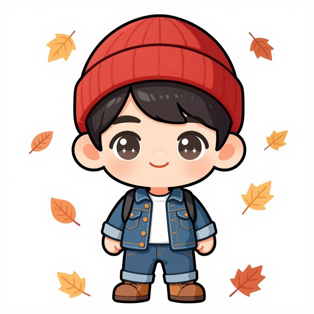 Chibi kawaii realism blend full-body sticker of little Asian boy with straight black hair and red beanie wearing denim jeans and boots in autumn park with falling leaves, white background, transparent PNG, neon highlights, upscaled, big sparkling eyes, cute smiling face