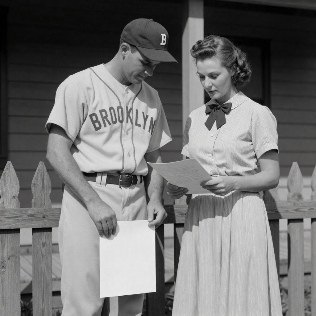 Black and white photograph of a man and woman standing by a wooden picket fence. Man in baseball uniform and cap, "BROOKLYN" on shirt, holding laundry. Woman in vintage dress with dark bow, holding papers. Both looking down. Wooden house in background. Man slightly bent forward, woman standing straight. Sunlight casting shadows.