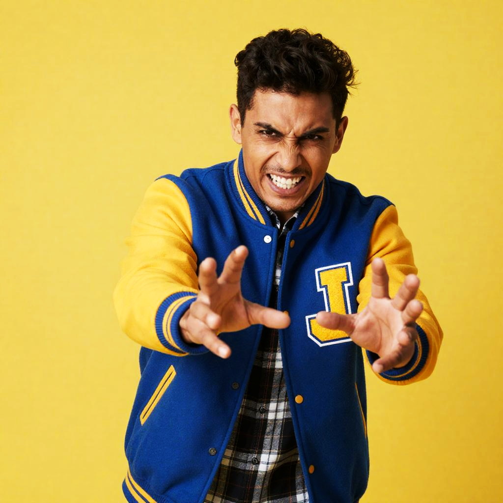 Photograph of a male with dark hair, intense expression, and bared teeth. He leans forward, reaching out with both hands. Wearing a blue and yellow varsity jacket with a large "J" on the chest, and a plaid shirt. Bright yellow background.