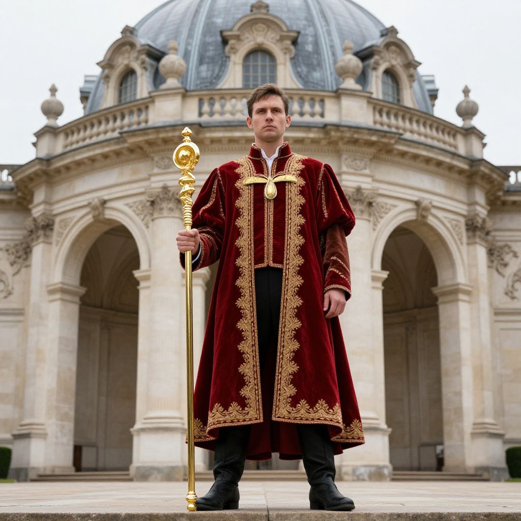 A serious man stands confidently in front of an ornate classical building with a domed roof and intricate stone carvings. He wears a long red velvet robe adorned with gold embroidery, black pants, and black boots, holding a golden staff in his right hand, evoking a historic and regal atmosphere.