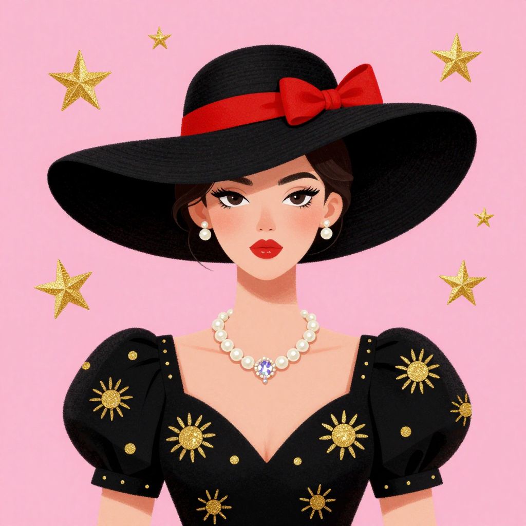 Elegant illustration of a glamorous woman wearing a wide-brimmed black hat adorned with a red bow, a black dress embellished with gold dots and sun symbols, and a sparkling pearl necklace, set against a vibrant pink background with six golden stars.