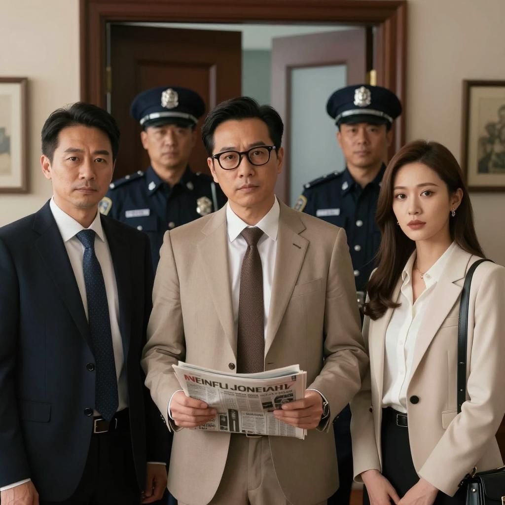 Four men in suits stand in a dimly lit room. Center man with dark hair, striped tie, gray suit, serious expression. Left man with gray hair, brown suit, white shirt, serious expression. Right man with bald head, gray suit, white shirt, serious expression. Man in background, medium brown hair, white shirt, dark suit, serious expression. Car window in background.