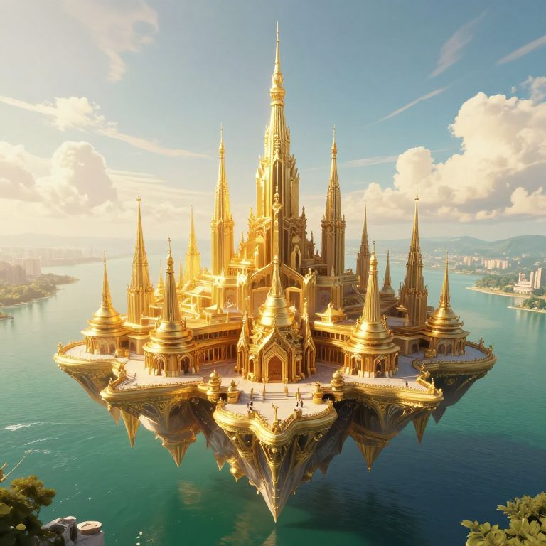 A majestic, golden city of impossible architecture floats serenely above emerald waters, its spires reaching toward the heavens like a dream of celestial engineering.