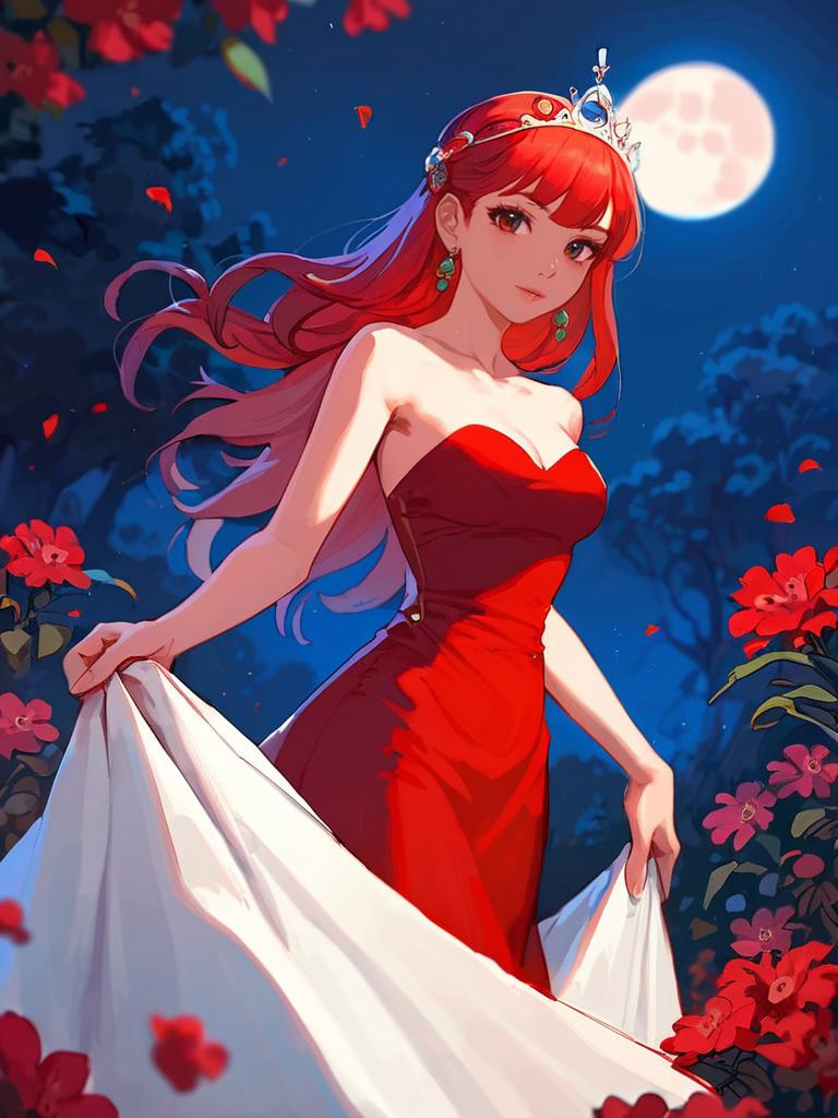 Portrait of a young woman with long red hair wearing an elegant strapless red dress with gold embroidery. She accessorizes with a floral tiara, dangling earrings, and a necklace. The scene is set outdoors at night with a large full moon in the background, surrounded by red flowers and trees. The woman looks directly at the viewer with bare shoulders and a serene expression.