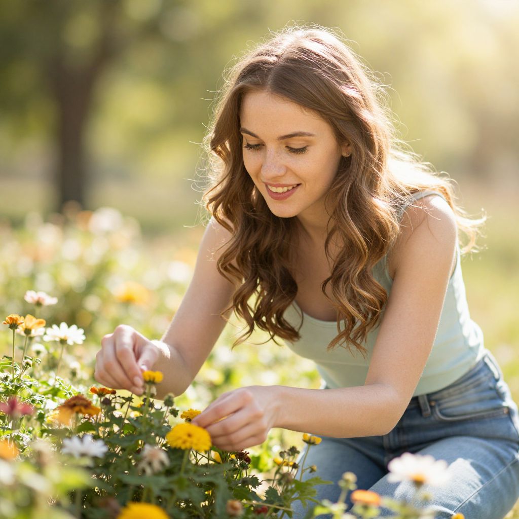 Photograph of a young white woman with long, wavy brown hair, wearing a light blue sleeveless top and blue jeans, kneeling in a sunlit meadow. She is smiling and gently picking yellow and white daisies from a colorful flower bed. The background is a blur of green trees and yellow sunlight, creating a warm, serene atmosphere. Her hands are delicately holding a flower, and her expression is content and focused. The image has a soft, natural light highlighting her features and the vibrant flowers.
