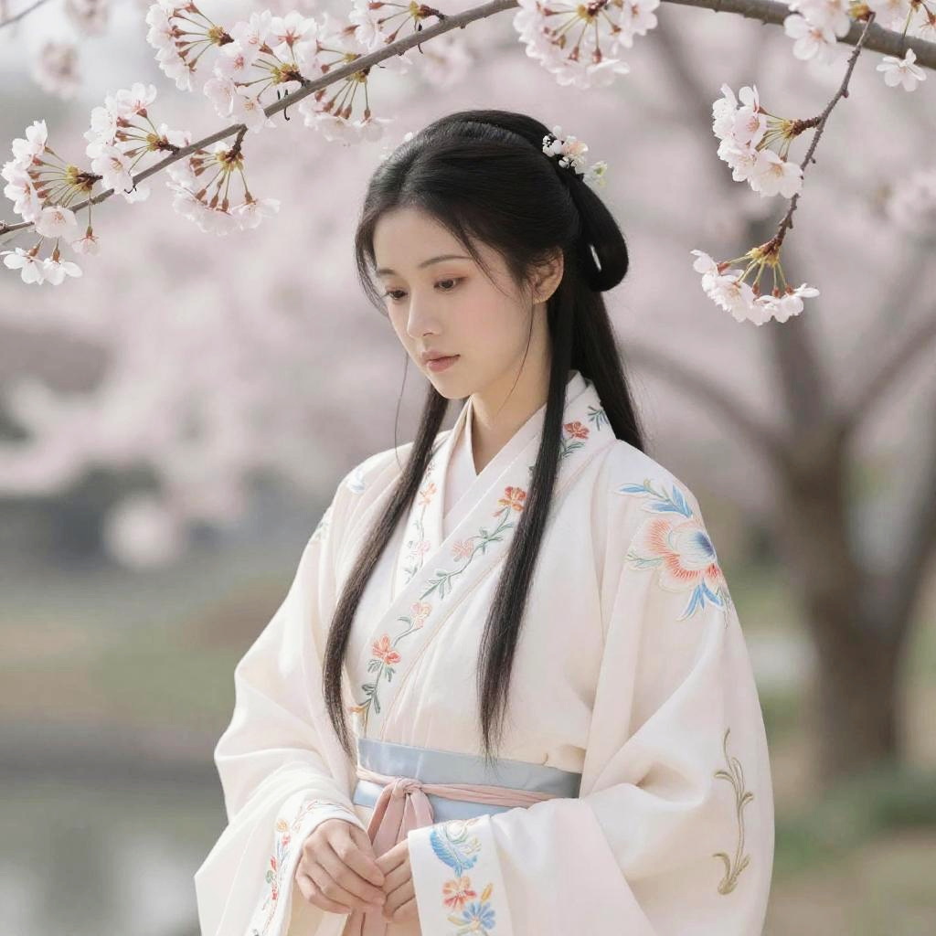 Jet black hair women dressed in traditional Asian attire, intricate embroidery, standing in a serene garden with cherry blossoms, soft pastel colors, delicate brush strokes