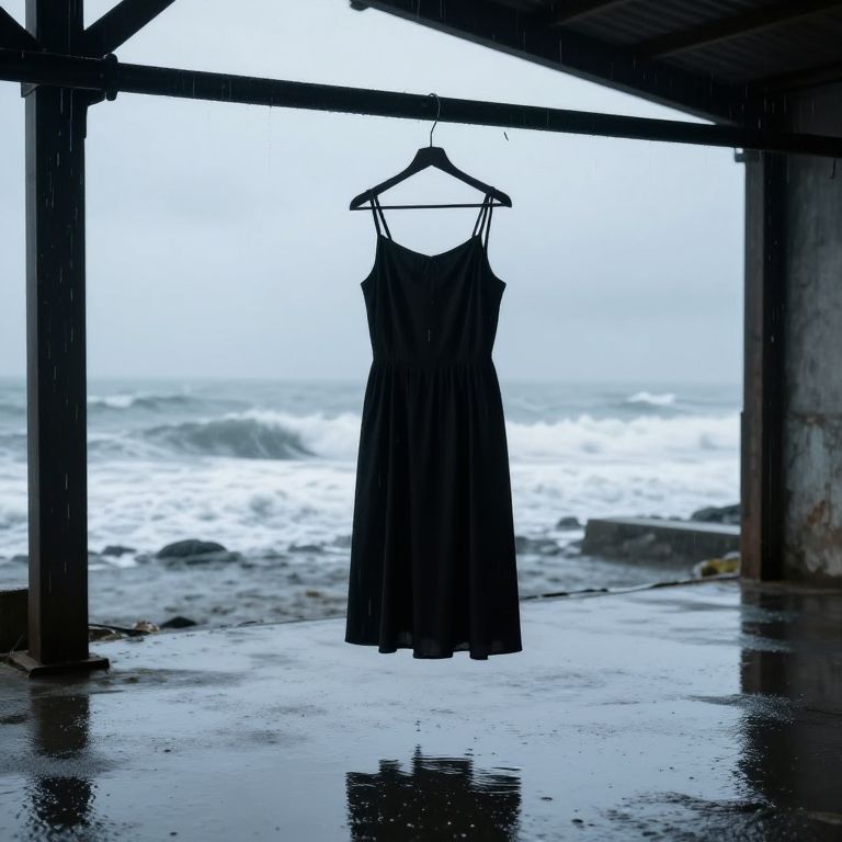 A minimalist black dress hanging in a rainy coastal warehouse, wet and reflective, reflections of stormy waves, moody lighting, industrial design, melancholic and atmospheric mood