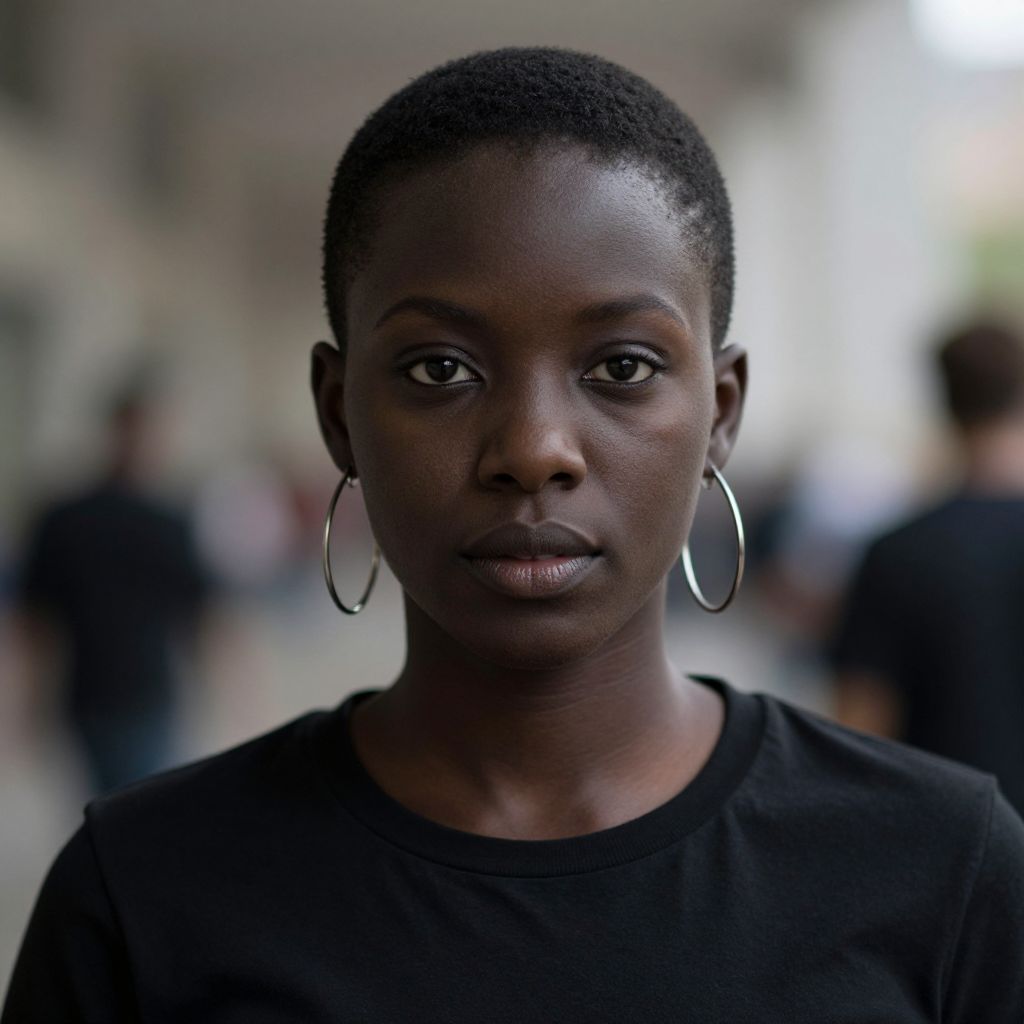 Jet black cosplay, solo, earrings, jewelry, realistic, 1girl, hoop earrings, blurry, black hair, portrait, blurry background, looking at viewer, dark skin, short hair, lips, shirt, photorealistic