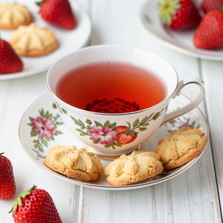 Strawberry Pie Tea: A vintage-inspired still life featuring a delicate floral tea cup adorned with pink and green botanical patterns, filled with vibrant red strawberry-infused tea and golden shortbread cookies, set against a rustic white wooden surface with fresh strawberries adding a pop of natural charm.